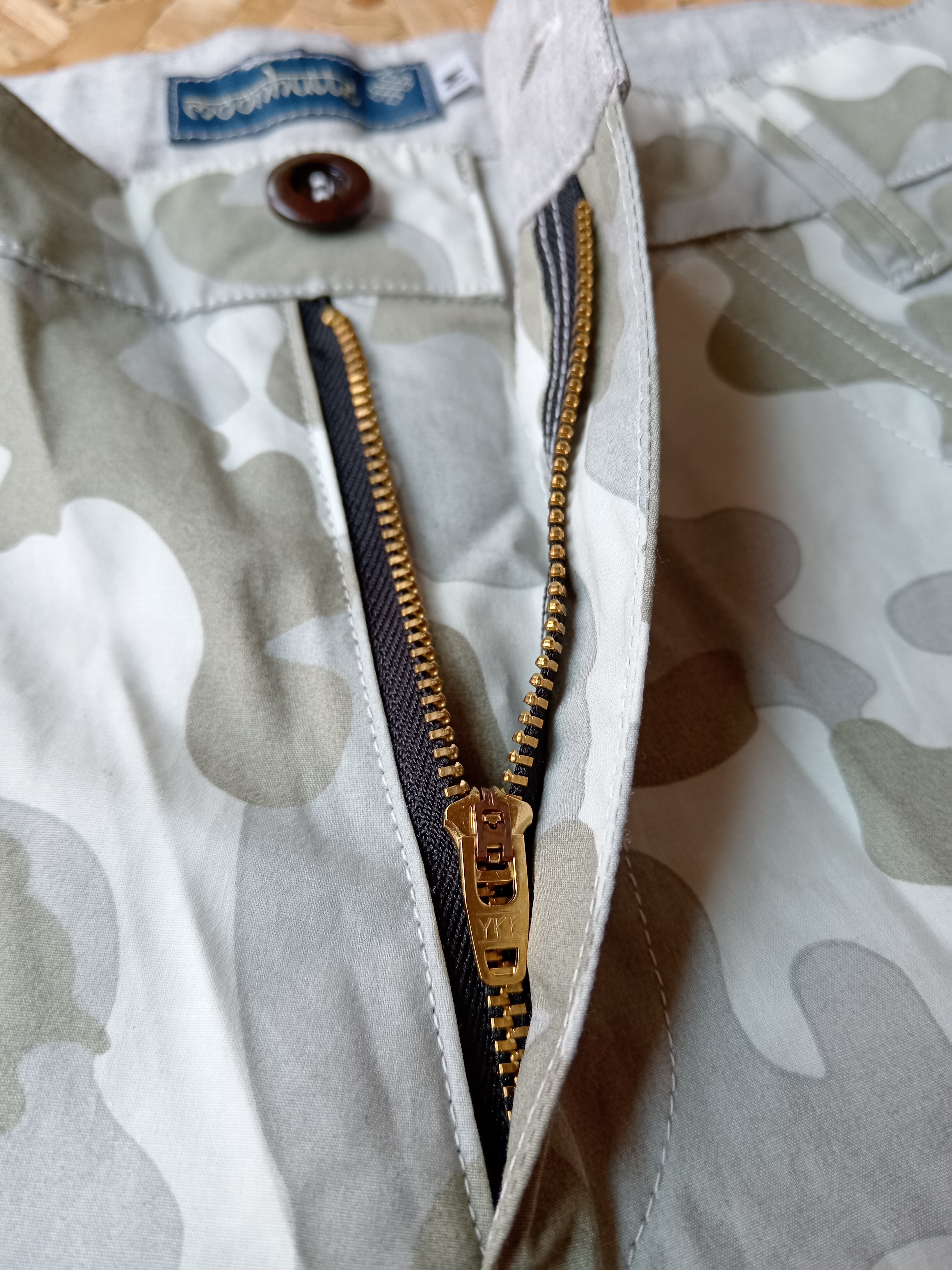 カモ柄の乾燥の早いコットン生地を使用しており、アクティブなシーンにぴったりです。ポケットの裏地や腰周りの裏地には別色の生地を使用しており、さりげないこだわりが光ります。