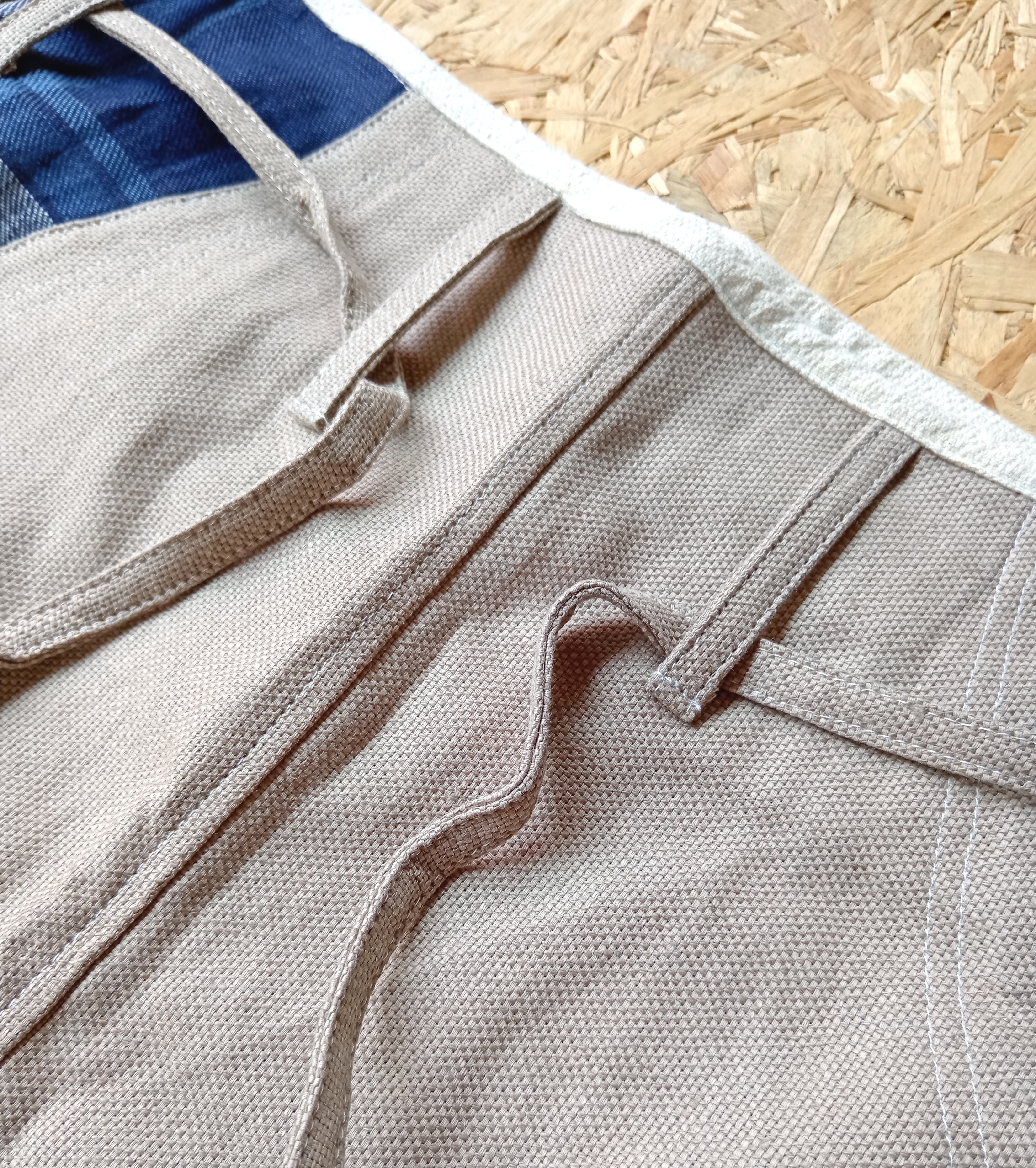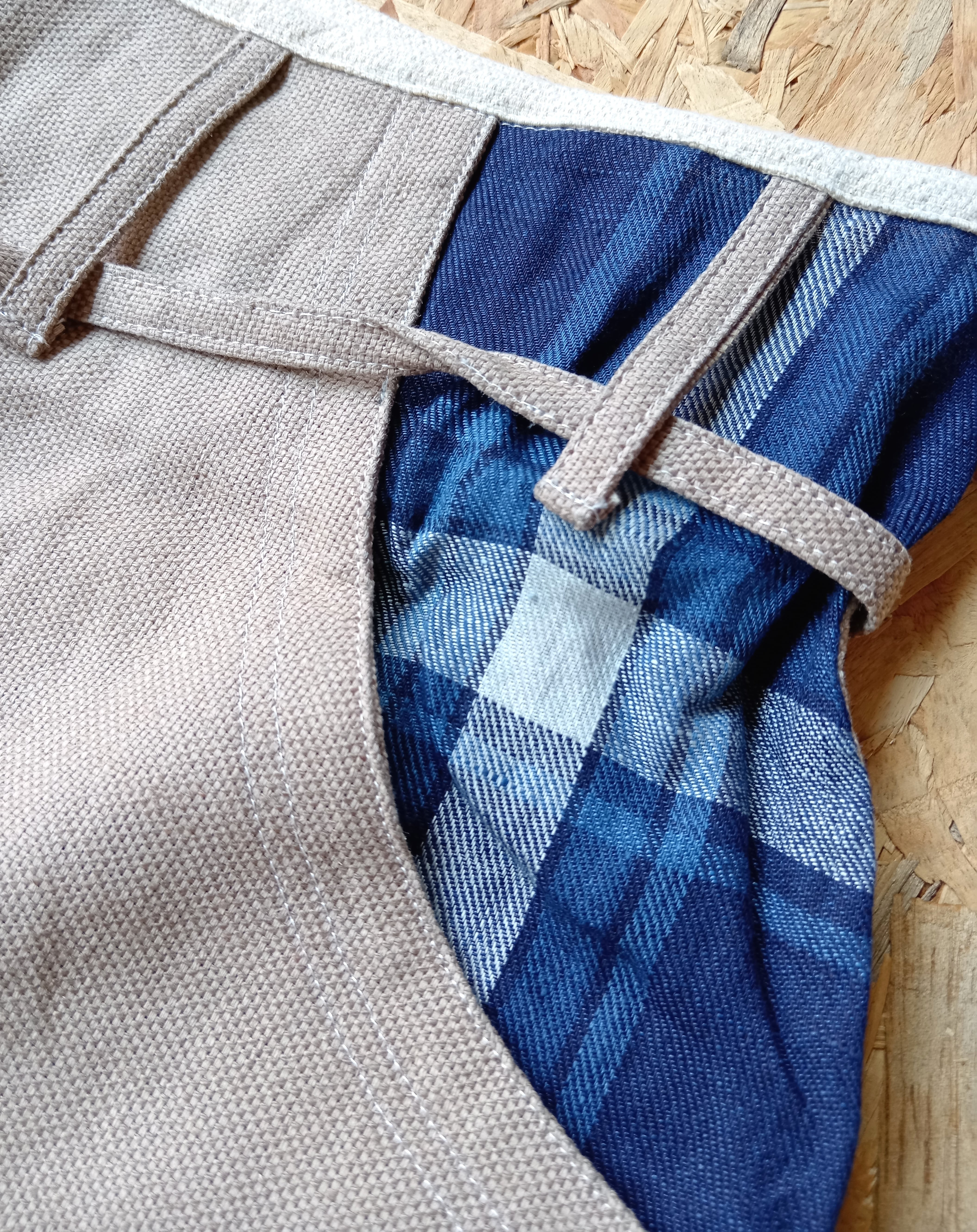 ポケット部には別柄生地の切り替えデザインが施されており、さりげなく個性を演出します。